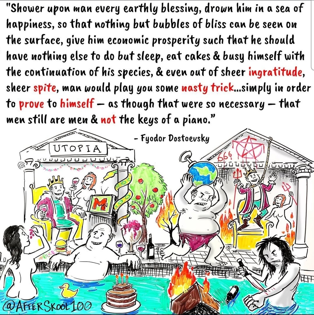 Fyodor Dostoyevsky was correct wasn't he pol?Even if given utopia man would destroy it out of sheer boredom of peace, the craving for chaos, and the unnecessary need to prove we have freewill.