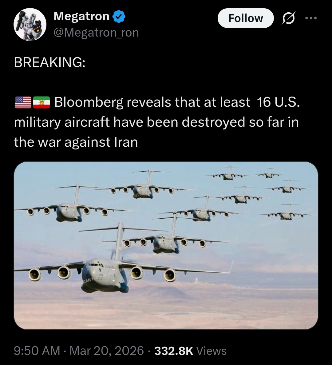In two weeks of Trump's "special 24-hour op" to overthrow Iran:>Allowed Israel to cuck him in to a war (per Rubio)>Uses it as a convenient way to avoid his pedophilia in the Epstein files>15 *confirmed* dead Americans, over 200 wounded>Unknown numbers of Americans captured>Trump says dead Americans "Is the way it is" and "there will be more">US commander tells troops Trump was 'chosen by Jesus to unleash Iran Armageddon'>Every US base in the Middle East destroyed by Iran's airstrikes>Order the strike that murdered over 150 Iranian schoolgirls>US fighter jets destroyed, at least 2 pilots captured>US reaper drones destroyed>US THAAD missiles almost completely exhausted>Kicks off a massive recession>Allows transgendering children>Backpedals on immigration enforcement>Begs NATO to get involved>Starting to mobilize 5,000 boots on the ground, more dead Americans>Strait of Hormuz closed>US gas prices skyrocketing>US refuelling plane destroyed, more casualties>US Embassy in Baghdad bombed by drones>Trump confirms the war is for gays "We support gays, but they throw gays off the buildings. We have to wipe out the evil">US F-35 destroyed>Deportations under Trump average 900 a day (300,000 a year), Obama deported 3.2 million>Trump cucks out and lifts sanctions on Iran oil>US Embassy in Baghdad abandoned>At least 16 US military aircraft destroyed, per Bloomberg >Four more weeks, goyim!