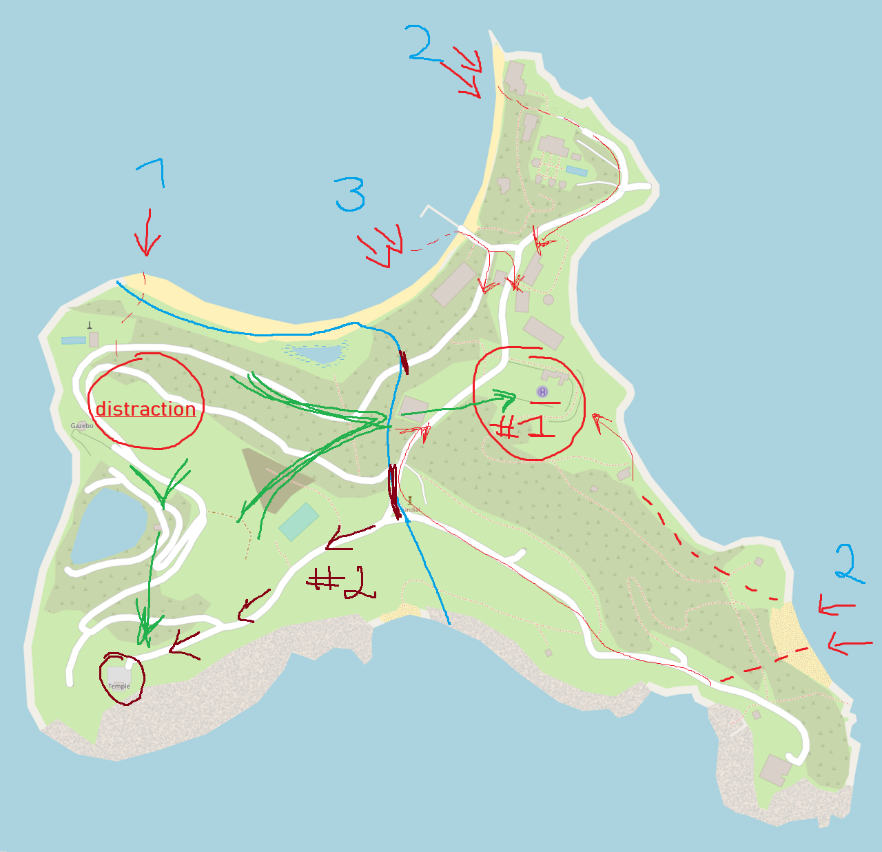 >>531237704ok so the way i see it you want to hoard the residents/enemies in one place after cutting off their escape routes. first 1 lands on the north west beach causing an alarm to be raised. this is a small group of operators that land there, make some noise, shoot some guns. it is expected that the pedos will try to get to the pier on north beach or the helipad in the east. this is why when group 1 lands to kick it off groups numbered 2 on the map are consecutively landing at north beach and the eastern front and make their way towards the middle of the island by the helipad side and the roads to cut off any escapees. that would cover the eastern part of the whole island. shoot on sight. group number 3 is there to support blocking the pier and securing the perimeter. once the helipad checkpoint is in control of our forces we continue deeper into the island blocking the main roads so the only way for the pedos to regroup is by meeting at the temple, which might help them on the defensive end but the escape routes are now blocked (green arrows to indicate direction of where they would try to go first, helipad then temple, after the group 1 havoc). with the beach and the whole eastern half of the island secured, groups 2 head deeper towards the temple and massacre all the pedos. at this point is game over. no exit. no escape. the only way out is to jump into the ocean and drown or meet your demise by the bullet. easy one really