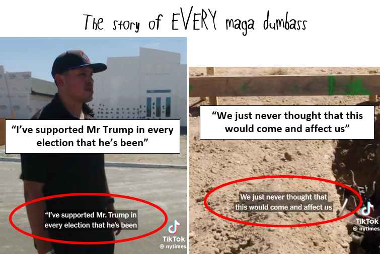 >vote for retard>retard does the retard thing>...I don't understand why he did this?!https://x.com/mistergeezy/status/2034782492570362235?s=20We went through all of this several times over in the last decade, and ex-MAGA still act like we need to give a shit he's making you suffer.For example, an area full of hispanic people voted several times for a guy who started out calling most Mexicans coming over rapists and murderers. Cool, not me, handle that as you will...>grabbing up visa holders>small businesses bankrupt>60% downturn in construction projectsOh, he then did exactly what he said he would do and your economy is in shambles?Who knew?Why in the fuck, did you think you were special? And worst you have liberals and moderates acting like if you don't coddle these retards, then they'll do the same shit, again. No, they do they keep doing the same shit, because you feed into their entitlement hoping they won't relapse into irresponsible fucktard (they will). These people have the arrested development of toddlers, and anyone who is a parent knows you don't make them better people by feeding into their selfishness and lack of empathy. That's how you create a generation of adults who lack accountability, shame, and critical thinking. You create somebody else's future problem.