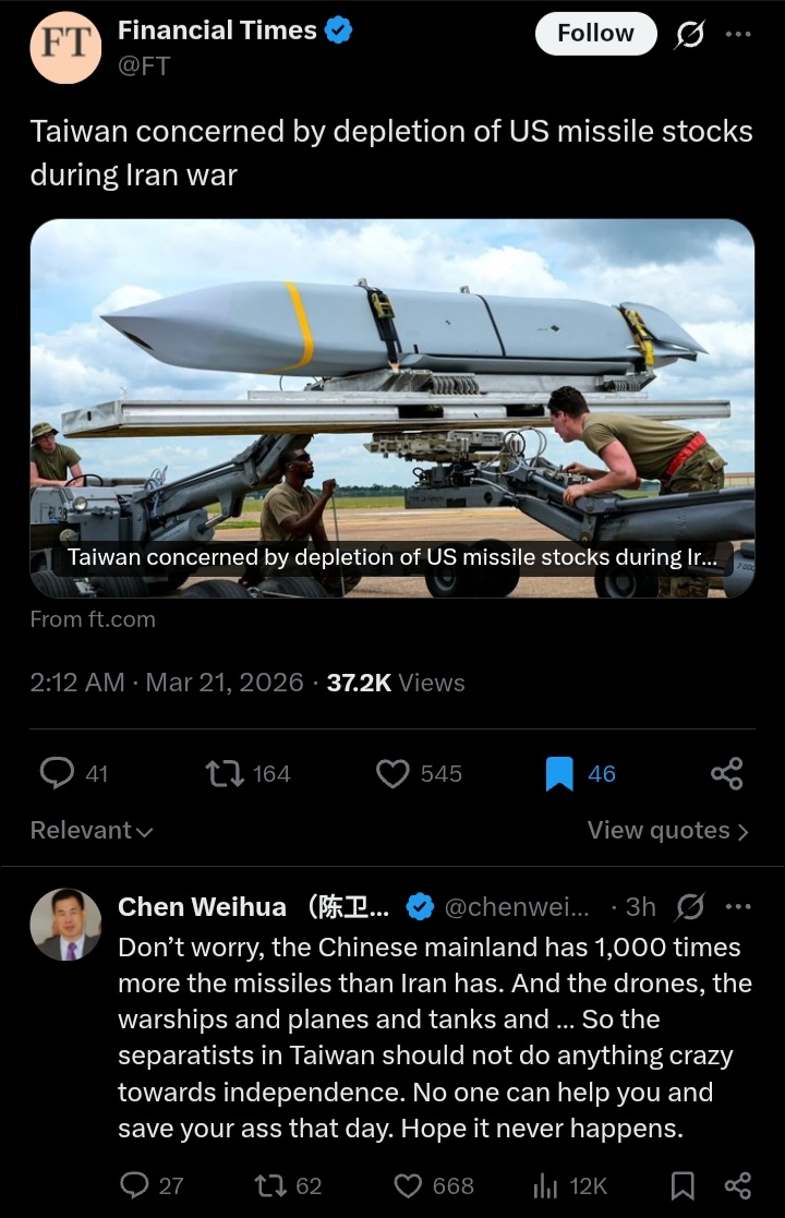 Taiwan is increasingly concerned about the depletion of US stockpiles of long-range cruise missiles. These weapons are considered essential for any potential US military support in defending Taiwan against a possible Chinese invasion or attack.The worry stems from ongoing US military involvement in a conflict with Iran where significant quantities of these missiles have been expended. Taiwanese officials fear this could limit Americas ability to provide adequate deterrence or direct assistance in a Taiwan Strait crisis, given the critical role such precision munitions play in countering large-scale threats like those from Chinas military.This highlights broader geopolitical anxieties in Taipei about US resource commitments being stretched across multiple global flashpoints, potentially weakening the credibility of American security guarantees in the Indo-Pacifichttps://www.ft.com/content/b52df43d-9eed-477c-9c01-d19ca2233cbdMeanwhile Chinas Taiwan Affairs Office offered "stable and reliable energy and resource security" to Taiwan under "peaceful reunification," citing benefits amid global instability. Taiwan rejected it. So far xDhttps://www.reuters.com/world/china/china-makes-energy-security-reunification-offer-taiwan-amid-middle-east-war-2026-03-18