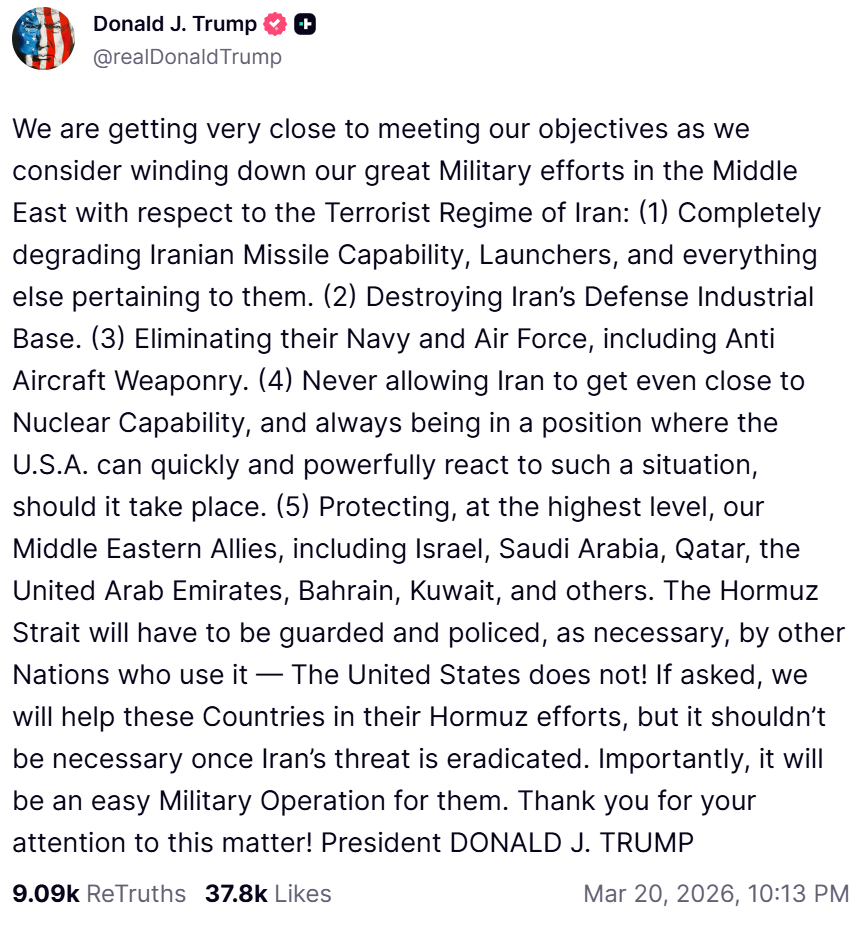 Trump is not abandoning the Strait of Hormuz. This is just a cover for when he actually invades Iran for real later this month. And when that fails, it will be the end of American hegemony.