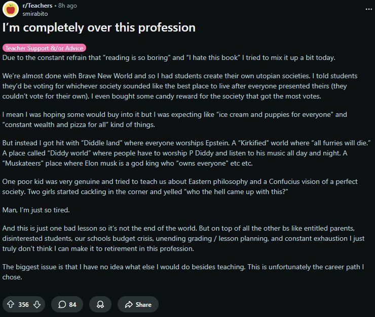 >>531258468>Why are teachers such sensitive faggots who can't take the piss?This.I work at schools (not a teacher) so I see/hear these kids every day, plus I have three Zoomers myself. This is exactly what I would expect from whatever age range would read Brave New World. I'm glad to hear they're reading a decent book and not The Crossover. Half the books they've assigned my kids were DEI/minority bullshit that aren't even classic books. They make them read colored books to the exclusion of actual literature now.And as for this teacher bitching, she can go to hell. The teachers at my school have Cadillac healthcare, a pension, excellent pay, etc. Complaining about grading and lesson plans? Give me a break. These kids are on iPads all day; teachers hardly grade shit, assign videos and online quizzes all the time, and their lesson plans are mostly prescribed by state regulations so they're not coming up with shit.Yeah the kids are retarded and demented, but honestly the teachers are mostly medicated Millenials who are lucky teacning is an option because they're not fit for a job where they'd actually have to work and think.