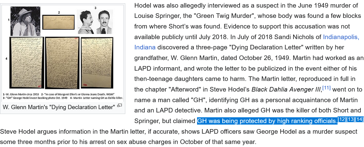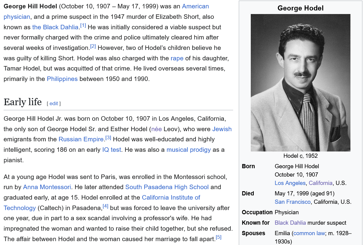 >>531266922>This FUCKER had 11 children with 5 different women. He was also accused of sexually assaulting one of his daughters, and found not guilty. Lovely.The reason he was acquitted in that case and why no charges were brought against him in the killing of the Black Dahlia (even though he is the most likely suspect), is because he was protected by the very same cabal that also protects the Epstein people today. The Black Dahlia killing happened before Epstein was even born. This matter didn't begin with him, and it certainly hasn't ended with his "suicide" you can be certain of that. Hell, Simon of Trent happened during the middle ages. This has been going on for thousands of years.But yes, George Hodel is almost certainly the real killer. But who else was protecting him? There was more in on it than just him. Elizabeth Short's blood was meticulously drained and collected for a purpose.