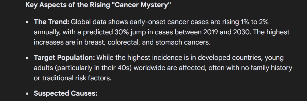 In the last three years:>two uncles got prostate cancer>one uncle got colon cancer and died>aunt had breast cancer>mom had breast cancer>dad developed parkinsons>sister had a miscarriageAll vaxxed and boosted. I'm sure it's just a coincidence.