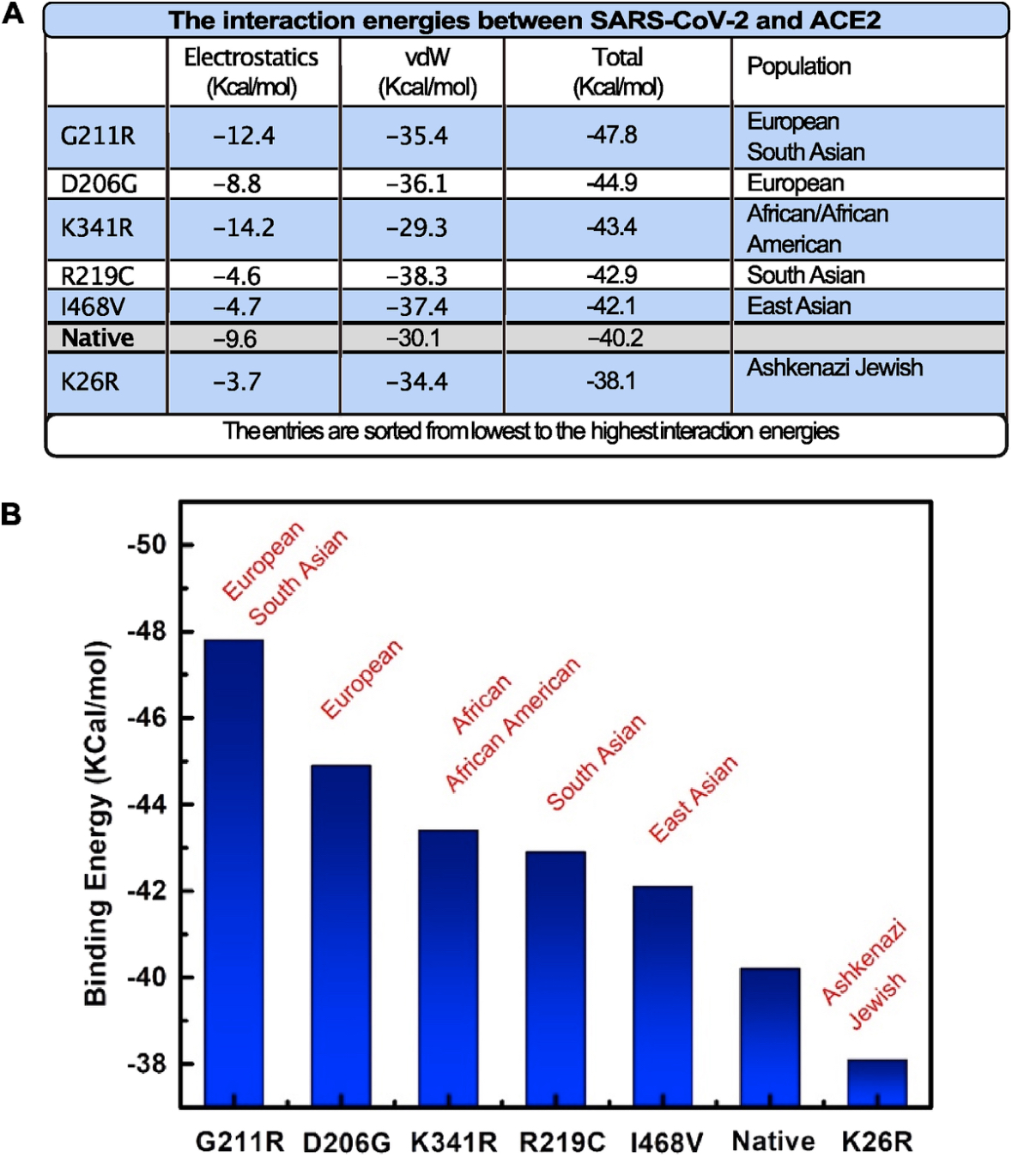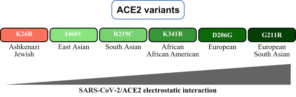 >>531264067>>531265681>The K26R variant which decreases the ACE2-virus binding was found to be most frequent in the Ashkenazi Jewish population (1.2%).> Finally, the D206G and G211R, which showed the strongest interaction with ACE2 were most abundant in the European population, mounting to 0.06% and ~0.2%, respectively. The G211R was also abundant in the South Asian population ~0.2%.>Our findings give indications regarding the populations that could be more prone to SARS-CoV-2 infection due to enhanced binding affinity.