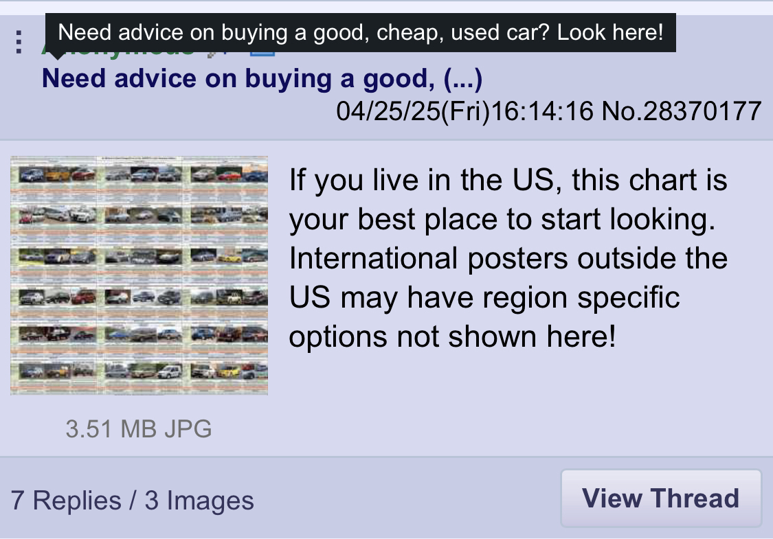 >>531266154>why are used cars so expensive these daysBecause adults behave like toddlers when it comes to their super special personal beep beep car. I buy cars for <$3000 and drive them until I can't. I talked to a 60 year old salesman at CarMax - he does the exact same (2007 Mazda 3). But he sells college girls a 2023 Jetta and sells customer service guys a 2024 King Cab because they're stupid baby brains about vehicles. It's actually very curious. Obviously these people don't wear designer clothes or have professional stylists. But they spend top dollar on a metal box to go Point A to Point B.