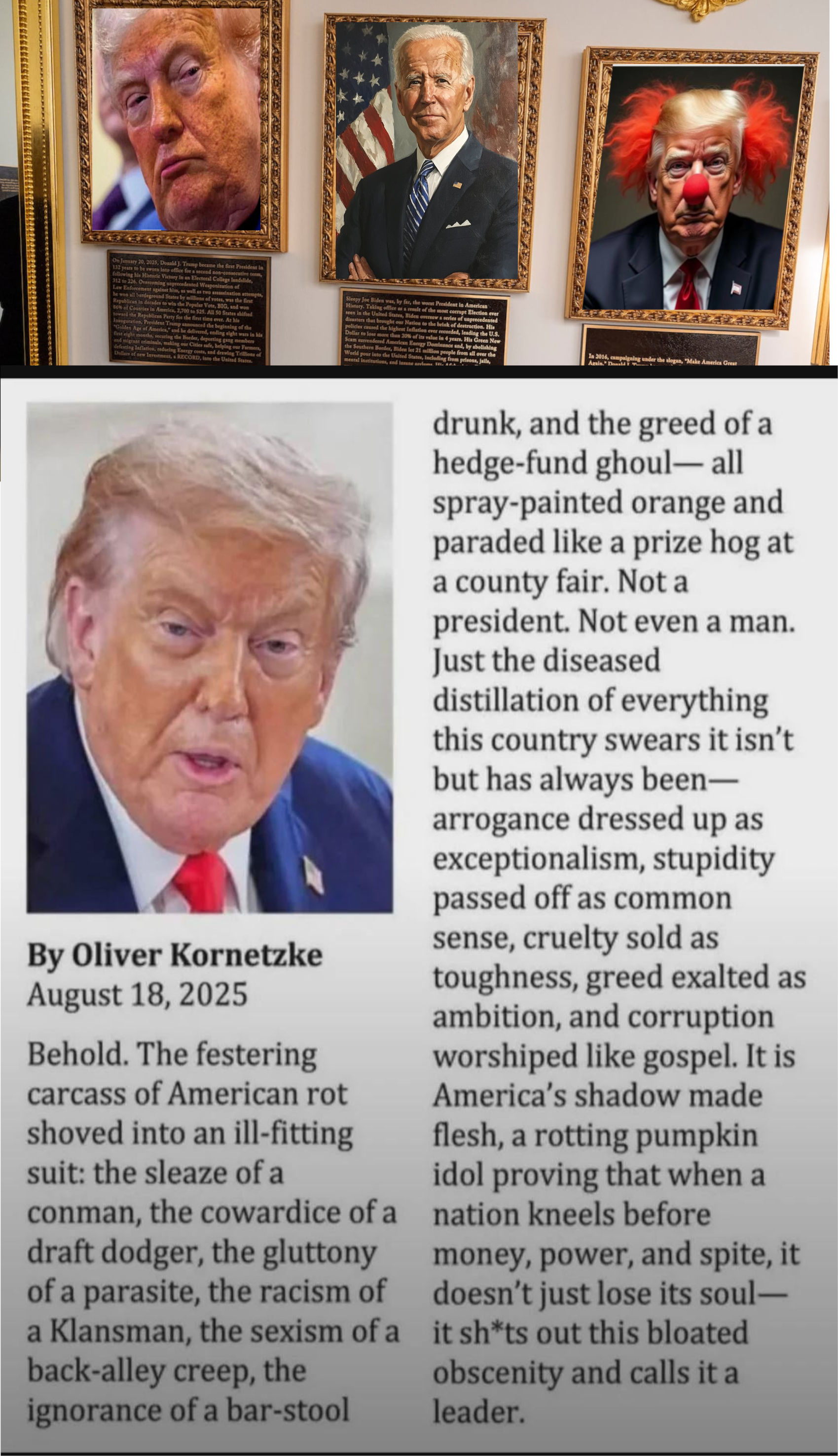 >>531269178>>531269845It is fascinating to me that he's allowed to do shit like this. Just openly slander former Presidents with childish rants on the walls of the White House, which surely is the property of the American people. There's really nothing to stop a President using public property for his own personal aggrandizement and propaganda purposes? I guess not, with him just claiming the Kennedy Center for himself as well.