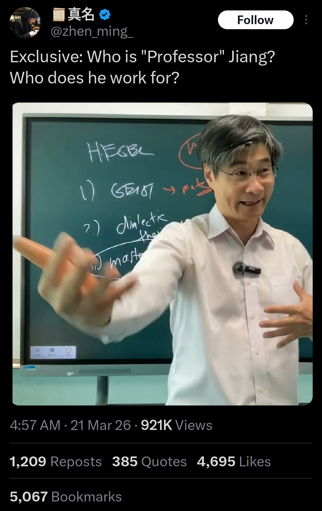 According to the breaking tweet, he was a NED-NGO regime change Gordon Chang figure in the 2000s and the 2010s in China and was even arrested for spying. He can be a controlled opposition of the CIA or just a grifter, with his conspiratorial content. He's a new Gonzalo Lira.