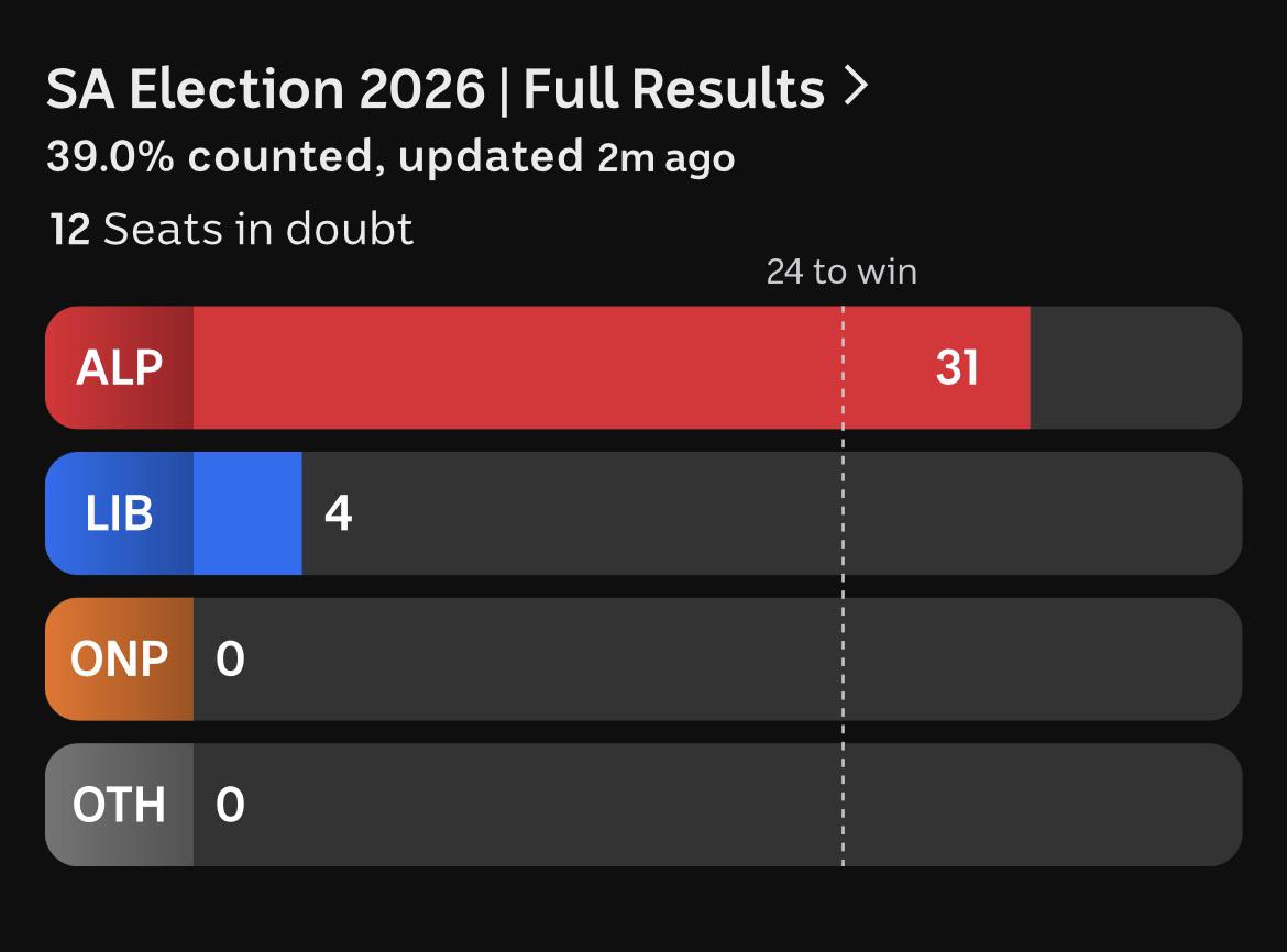 >>531273639Not sure i get this trolling.one nation were expected to get a 20-25% primary given polling, which they gotthey likely picked up three upper house seats, and at least 1 lower house seat, maybe 2, which is what was expected, maybe even better than what was expected (most people were saying 2 upper and no lower)south australia was always going to be a labor landslide, and the only reason people were interested in it was to see if one nation's primary was actually that high like the polls were saying or just an illusionI'd say the swings in strong labor seats like Light would also be a concerning indication for federal labor.