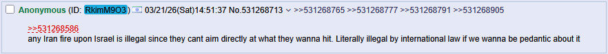 >>531280753The osint scene has backed up Ukrainian claims consistently; the Russians lie their asses off every single day. >>531280958>Not really how you open peace talks if you want peace.According to the British, they offered up their nuclear material, and the talks were progressing. No matter what, your strategy has resulted in a way more radical Iran that looks like a military junta at the moment, and you are not making significant progress at regime change, and the theatre is a shitshow from the UAE to Baghdad. Killing people during negotiations, with decapitation strikes aimed at religious leaders, i mean what the fuck were you thinking? You have caused a shitshow that is beyond ridiculous at the moment. And now the IRGC basically runs the show so goodbye moderates.