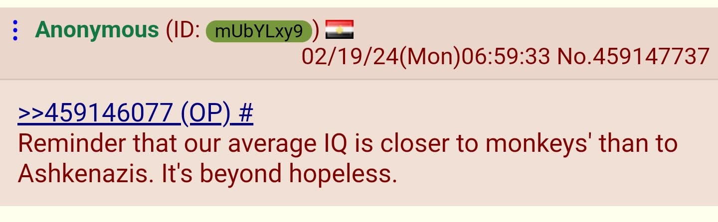 >>531278493I noticed as a kid in school who was taught to be non racist, that I had to dumb myself down for blacks to understand me and I never had that problem with anyone else.I just want us to have a country like everyone else and I don’t really care who’s superior.Besides. Everyone thinks they’re superior