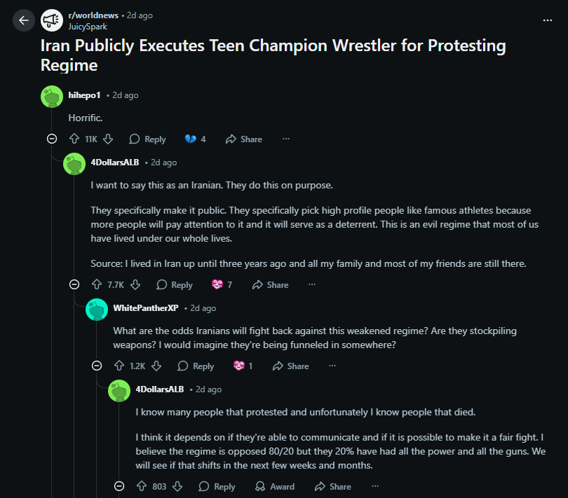 >>531278912the calm iranian streets (aside from american bombs) don't reflect this >>531278985I'm looking for those mutinies against the regime man
