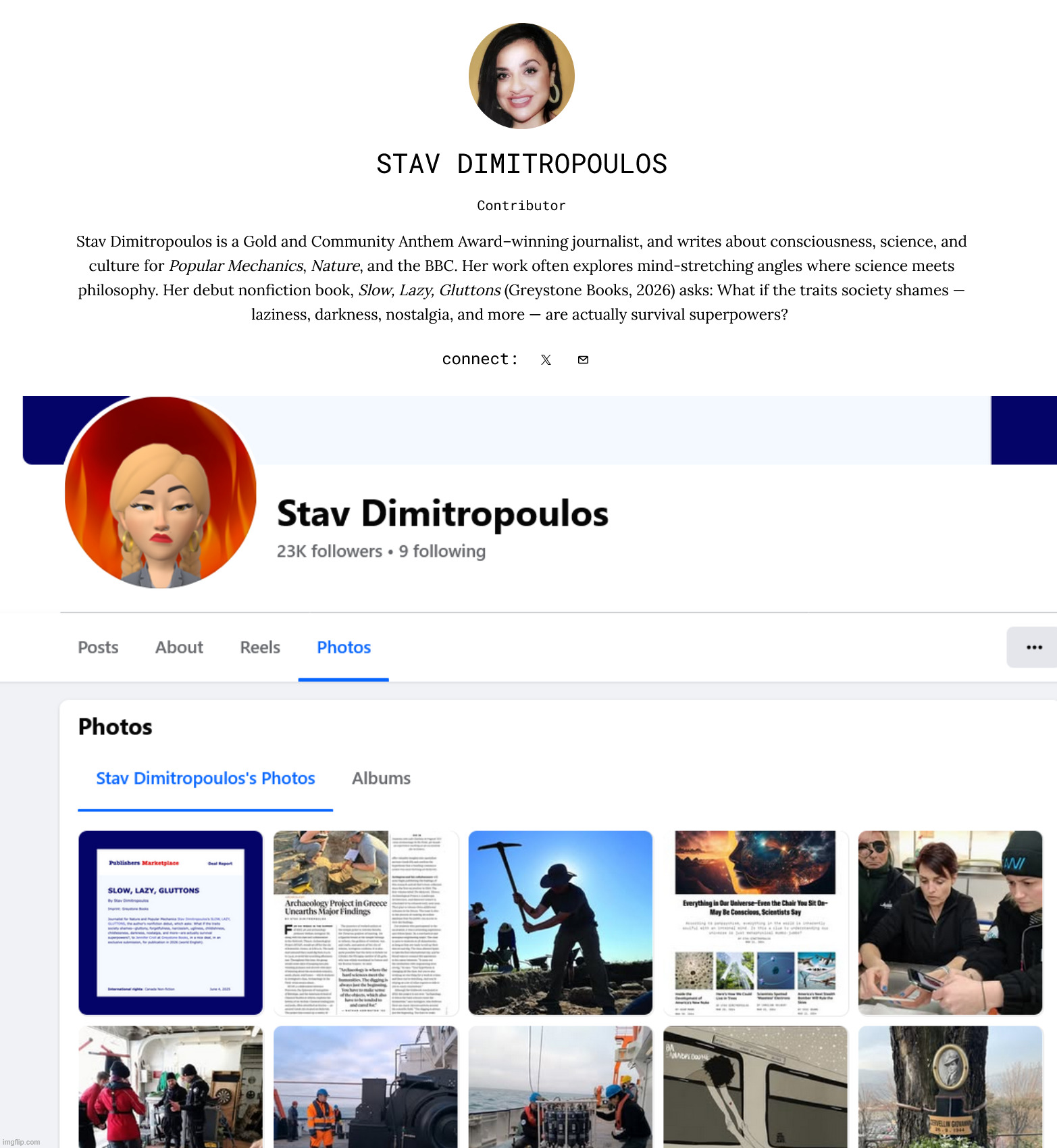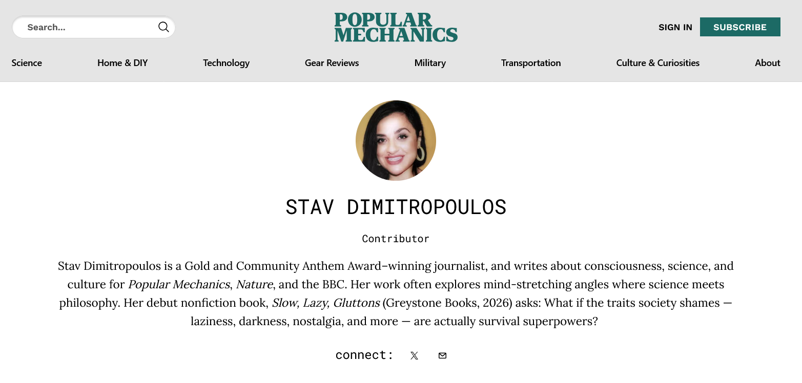 Ok so this might be kinda out there but bear with me. Think I found evidence of Dead Internet that's also pushing anti-human shit??>Open firefox homepage >See thumbnail for article, "Human Consciousness Is an Illusion, Scientists Say" (top of picrel)>Must be another muh reality fake article that's seemingly everywhere nowadays>Click on article but hidden behind paywall>Check out author's work, some Greek bitch>Her entire Popular Mechanics portfolio is a stream of muh "simulation theory"-adjacent garbage about human consciousness>Most likely takes a random quote from some scientist & extrapolates it into a bullshit article w/ every Sam Harrisism>Every headline has the same cookie-cutter "And Here's Why" shitlib styleIt seems to me like this simulation shit is intentional demoralization propaganda. I've been noticing more & more of this as of late."Oh it's all fake. Reality isn't real. We're nothing! But also we're God! But also God's fake! We're all cosmic space cum. George Carlin!"Do any of you feel the same? Does anyone else know what I'm talking about? >https://www.popularmechanics.com/author/222985/stav-dimitropoulos/Anyway I decide to dig more into the author bc something about her picture doesn't seem right. It gets weird but I could just be schizo.Cont.