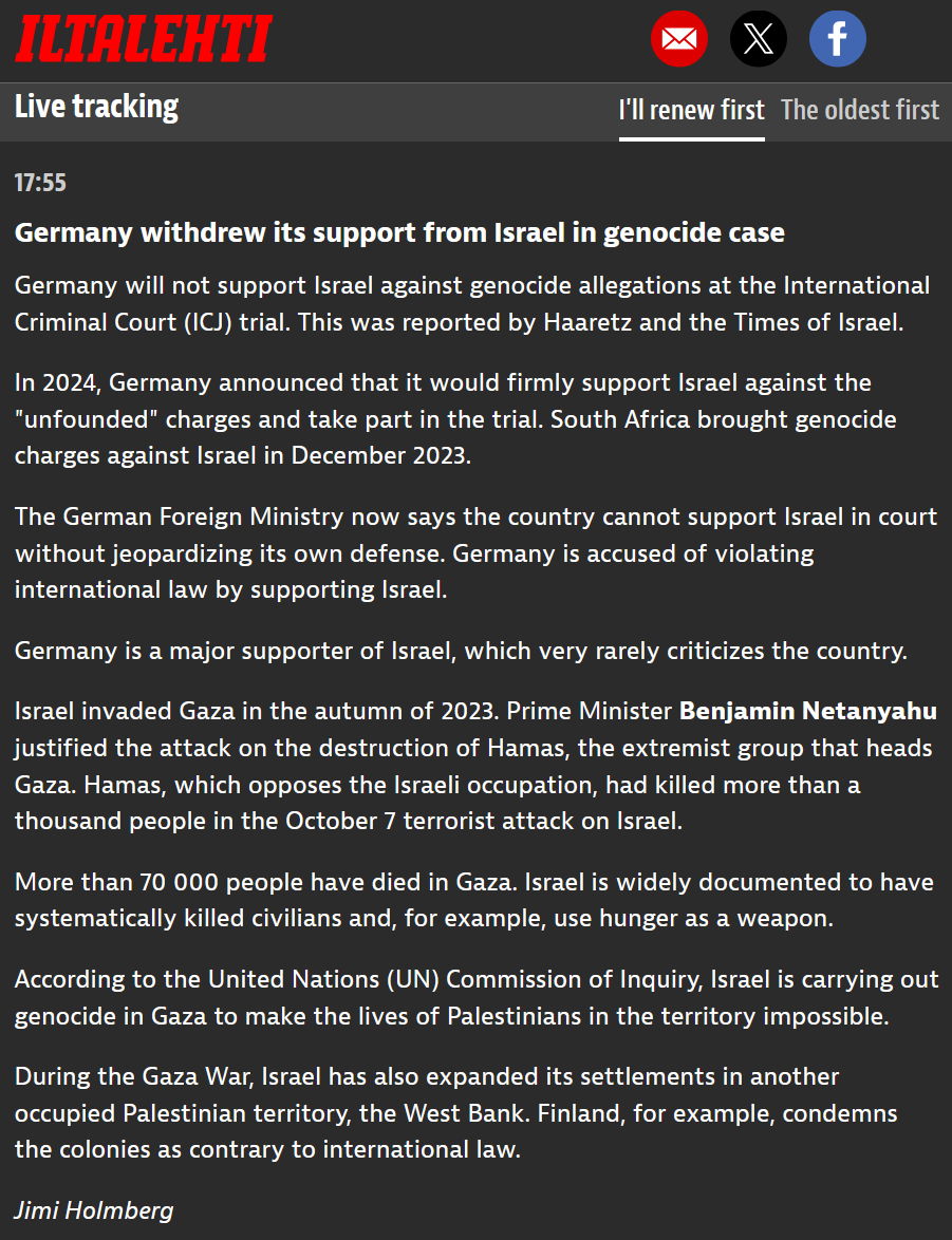 >Germany withdrew its support from Israel in genocide case>Germany will not support Israel against genocide allegations at the International Criminal Court (ICJ) trial. This was reported by Haaretz and the Times of Israel.>In 2024, Germany announced that it would firmly support Israel against the "unfounded" charges and take part in the trial. South Africa brought genocide charges against Israel in December 2023.>The German Foreign Ministry now says the country cannot support Israel in court without jeopardizing its own defense. Germany is accused of violating international law by supporting Israel.>Germany is a major supporter of Israel, which very rarely criticizes the country.blocked terror friend
