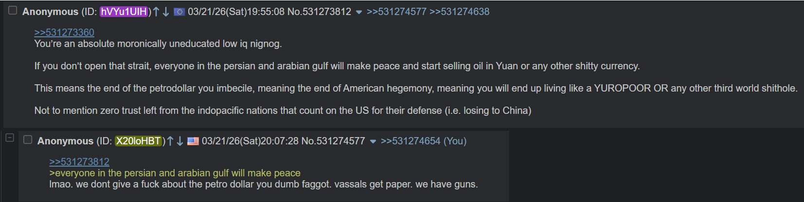 >>531280500nigger is trying and failing to kickstart an argument between chuggers. -500000 izzat