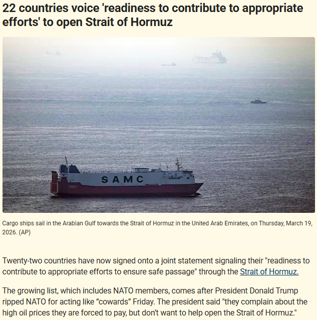 >>531282512Moving those goalposts again aren't you? US ask it's NATO allies to protect shipping, not to help offensively.>We express our readiness to contribute to appropriate efforts to ensure safe passage through the Strait. We welcome the commitment of nations who are engaging in preparatory planning.https://www.gov.uk/government/news/joint-statement-from-the-leaders-of-the-united-kingdom-france-germany-italy-the-netherlands-and-japan-on-the-strait-of-hormuz-19-march-2026