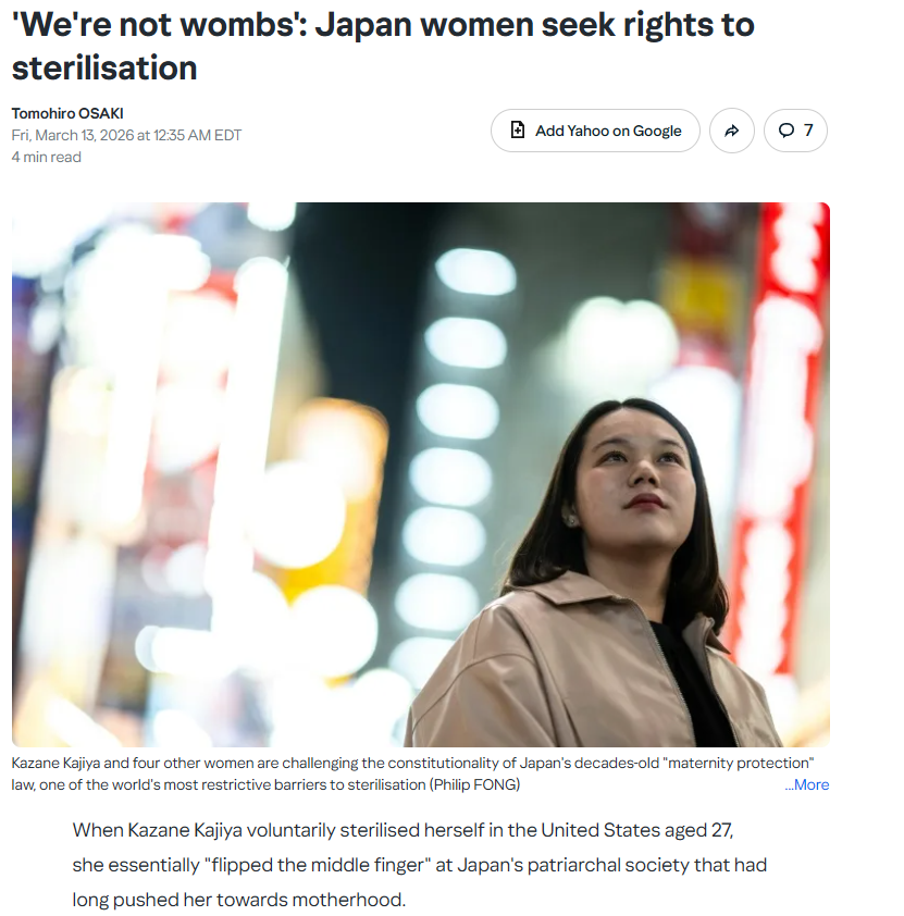 >>531280400>patriarchal society that had long pushed her towerds motherhoodDude, Japan had a low birth rate even the year she was born. It was almost totally normalised for Japanese women to have no kids in the early 2000s.These liberal media always try to depict Japan as some ultra-conseravative dictatorship but the way they do that is actually so fucking stupid.