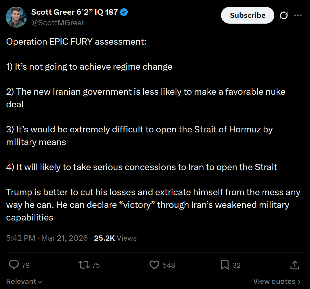 Previous: >>531279338Timeline:▶ Day 22>WTI $98>Brent Crude $106>Air defense hits Israeli F-16, IRGC claims>Nataz uranium refinery hit>Iraq military intelligence HQ hit▶Day 21>Japanese ships may cross the strait of Hormuz if they pay in Yuan>Iran targeted Diego Garcia base with ballistic missiles>One of the missiles failed in flight, while a U.S. warship fired an SM-3 interceptor at the other, although it could not be determined if the interception succeeded>Bloomberg confirms US lost 16 aircraft (including drones)>The Trump Administration has made "detailed preparations" for deploying US ground forces into Iran.>Entire NATO mission had withdrawn" from Iraq>Trump followed his campaign promise today he withdrew the US from Iraq.>Trump calls NATO a "Paper tiger" saying it would be 'easy' for them to help open strait>A new international group called "Earthquake Faction" burns an Israeli weapons factory in the Czech Republic>US B-52 Bombers spotted using long range JASSMs, indicating a lack of American aerial superiority>Israel attacked Syrian government positions and military camps in southern Syria during the night.>The IDF says it was in response to attacks on the Druze population in As-Suwayda▶Livestreamshttps://www.youtube.com/watch?v=4E-iFtUM2kkhttps://www.youtube.com/watch?v=JHwwZRH2wz8▶Telegramhttps://rentry.org/tgnews▶Twitter accountshttps://nitter.net/clashreporthttps://nitter.net/FaytuksNetworkhttps://nitter.net/sentdefender▶Israel Rocket Alertshttps://www.tzevaadom.co.il/en/▶Air Traffichttps://www.flightradar24.com/https://flightaware.com/livehttps://globe.adsbexchange.com▶Maritime Traffichttps://www.marinetraffic.com/