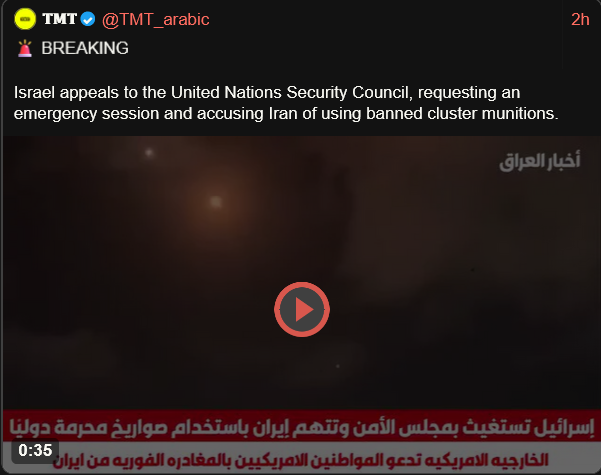 >>531283315>Israel wants to have the UN ban the use of cluster ammunition by Iran. They are le unfair.I'm not seeing either Israel or Iran on the list:https://en.wikipedia.org/wiki/Convention_on_Cluster_MunitionsMaybe Israel can go and cry about it?
