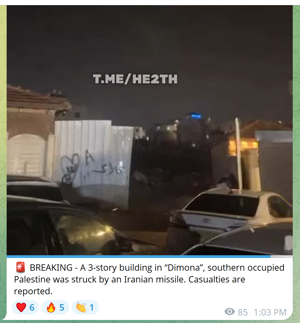 >>531283098KINO WATCH VIDEO>Confirmed impact of one missile @DimonaNothing confirmed on the power plant yet to be clear> Local reports indicate a three-story building was hit in Dimona. Four casualties are reported.Got some telegram talking of two other hits