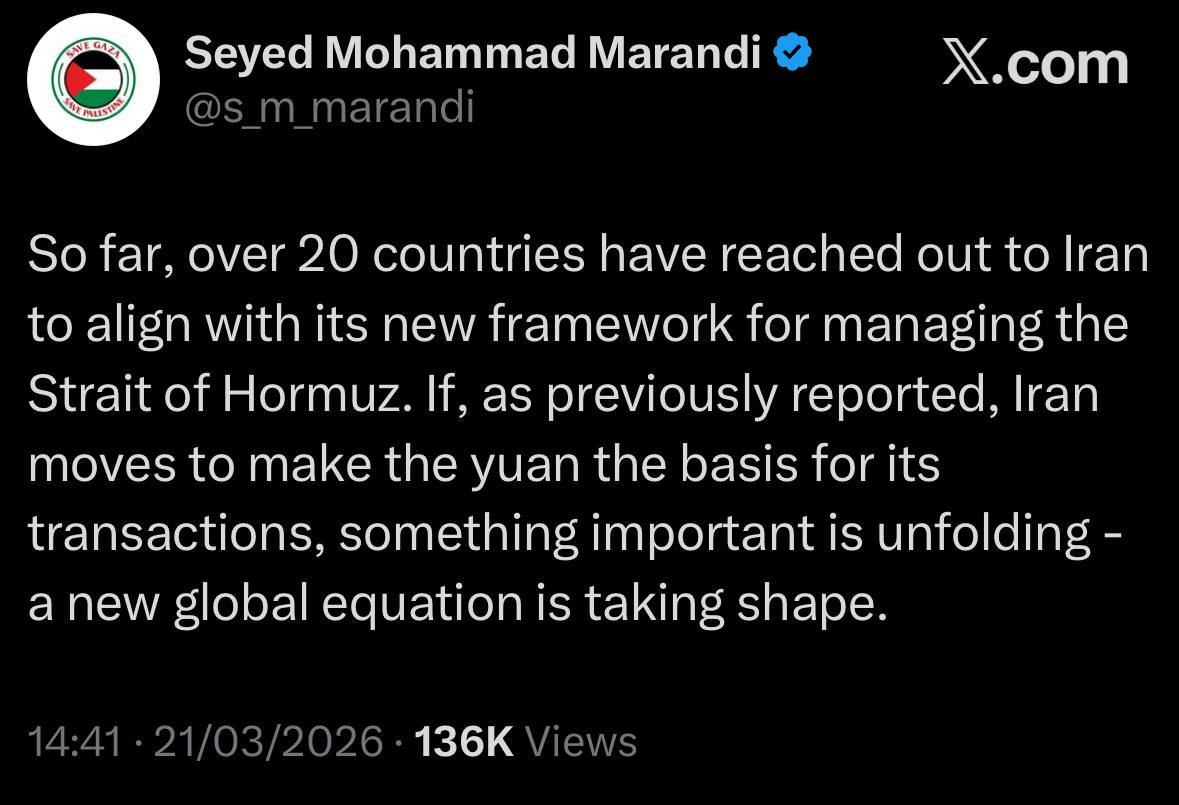 >>531285335>the petroyuan is inevitable at this pointYeah. Even if it's only 20 countries, or even 5, that go along with this, those 5 countries can just re-sell the Iranian oil at a profit, in US dollars.We saw this with India buying Russian oil and then re-selling it for a profit during Ukraine War and now again the last 2 weeks.
