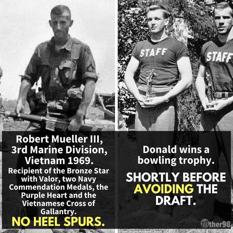 >>531285336Trump envious of US Marine who went to Vietnam voluntarily. >>531285636Came from a very wealthy family, formative adulthood was during Vietnam. Was exempt from the draft since he was in college but decided to join the US Marines after one of his classmates was KIA while leading point on S&D patrol, deep in jungle enemy territory. He put a pause on his Princeton education and sought to enlist as an infantry officer. With in about two years of being in country with numerous enemy contact in the one of the most active COPs, he received direct and disabling small arms fire that left him with a permanent limp. Of this limp, he said he didn't mind it since it would always remind him of time in service, of those who helped him, and of those that didn't comeback. >Reflecting on his service in the Vietnam War, Mueller said, "I consider myself exceptionally lucky to have made it out of Vietnam. There were many—many—who did not. And perhaps because I did survive Vietnam, I have always felt compelled to contribute." In 2009, he told a writer that despite his other accomplishments, he was still "most proud the Marine Corps deemed me worthy of leading other Marines." "I ran point many times and never said no when asked. I never held anyone against not volunteering for it. I had made peace with God. If it was my time, then I'd rather it be me than the guy to my right or left."Robert Swan Mueller III was 81 years old.