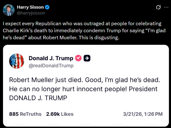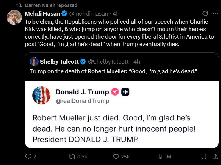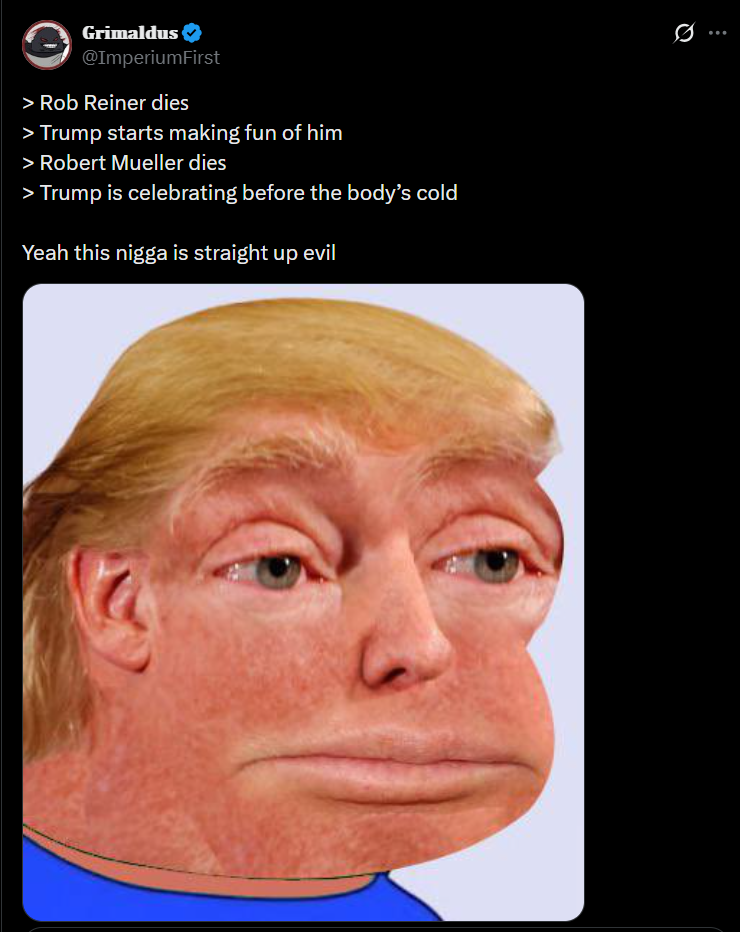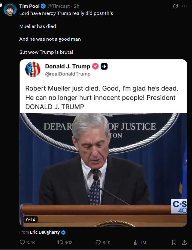 >>531299709I'm fine with Trump doing a victory lap on the grave of someone that tried to destroy him. The left normalized gloating over the dead with Charlie Kirk. Im going to gloat over Mueller's corpse tooLMAO MUELLER IS FUCKING DEAD