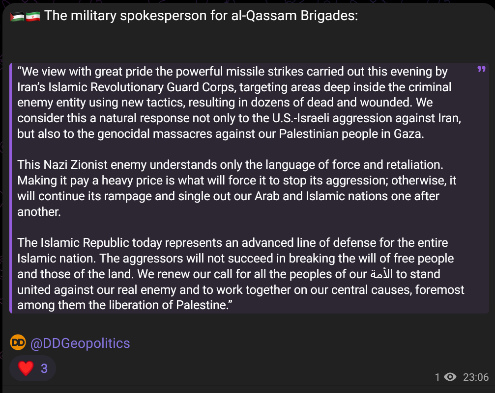 Previous: >>531302450Timeline:▶ Day 22>WTI $98>Brent Crude $106>Iran has issued an urgent official warning calling for the immediate evacuation of the Dimona nuclear reactor in Israel.>Hundreds of casualties in Arad, Southern Israel after missile strikes>Iran has achieved "total missile dominance over the skies of Israel", IRGC Aerospace Force Commander says>Israel successfully intercepts Iranian missiles with a building in Dimona>Air defense hits Israeli F-16, IRGC claims>Nataz uranium refinery hit>Iraq military intelligence HQ hit▶Day 21>Japanese ships may cross the strait of Hormuz if they pay in Yuan>Iran targeted Diego Garcia base with ballistic missiles>One of the missiles failed in flight, while a U.S. warship fired an SM-3 interceptor at the other, although it could not be determined if the interception succeeded>Bloomberg confirms US lost 16 aircraft>Entire NATO mission "withdraws" from Iraq>Trump followed his campaign promise today he withdrew the US from Iraq.>Trump calls NATO a "Paper tiger" saying it would be 'easy' for them to help open strait>A new international group called "Earthquake Faction" burns an Israeli weapons factory in the Czech Republic>US B-52 Bombers spotted using long range JASSMs, indicating a lack of American aerial superiority>Israel attacked Syrian government positions and military camps in southern Syria during the night.>The IDF says it was in response to attacks on the Druze population in As-Suwayda▶Kinohttps://files.catbox.moe/2hwzcx.mp4▶Livestreamshttps://www.youtube.com/watch?v=4E-iFtUM2kk https://www.youtube.com/watch?v=JHwwZRH2wz8 ▶Telegramhttps://rentry.org/tgnews▶Twitter accountshttps://nitter.net/clashreporthttps://nitter.net/FaytuksNetworkhttps://nitter.net/sentdefender▶Israel Rocket Alertshttps://www.tzevaadom.co.il/en/▶Air Traffichttps://www.flightradar24.com/https://flightaware.com/livehttps://globe.adsbexchange.com▶Maritime Traffichttps://www.marinetraffic.com/