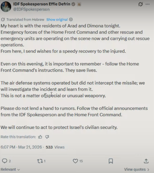Israeli broadcasting authority says that Iranian attack on Arad has resulted in the highest number of casualties since the war began>Israeli broadcasting authority says that Iranian attack on Arad has resulted in the highest number of casualties since the war beganIsraeli broadcasting authority says that Iranian attack on Arad has resulted in the highest number of casualties since the war began>Israeli broadcasting authority says that Iranian attack on Arad has resulted in the highest number of casualties since the war began
