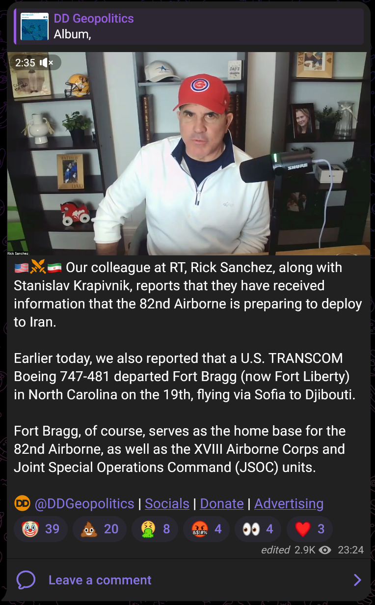 >Rick Sanchez, along with Stanislav Krapivnik, reports that they have received information that the 82nd Airborne is preparing to deploy to Iran.