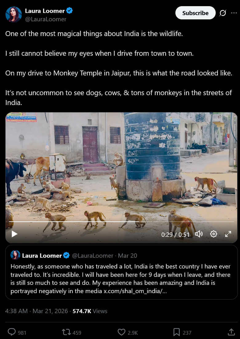 >>531307480looks and sounds like she's making fun of india to mei don't like loomer though