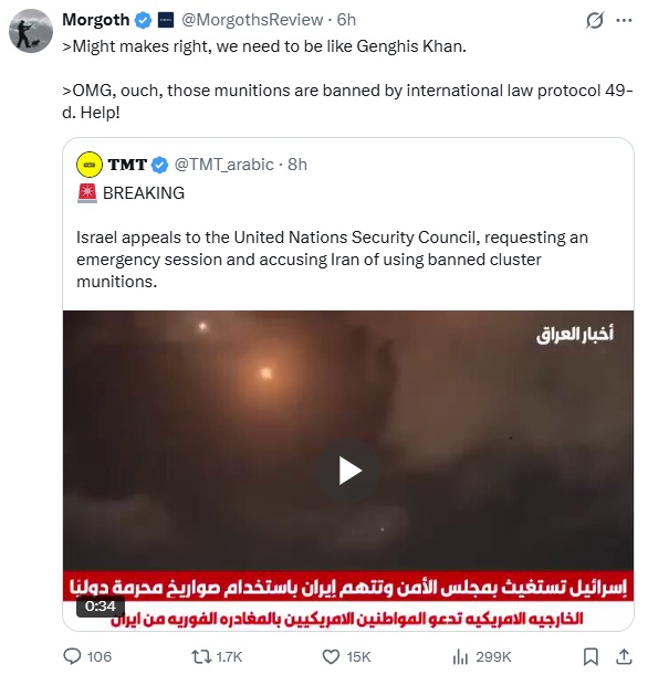 >>531313626Some of them say "we hate muslims, you aren't pro Muslim are you?"Some of them are claiming this is some grand strategic ploy against China, actually. Some of them are literally denying jews have any influence over America and saying other groups like the Irish have more influence, denying the jewish lobby, saying that it's a war for America and America benefits in the war.