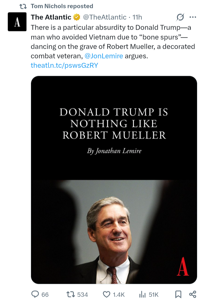 >>531349137Sure is something that all of those crocodile tears over Trump saying what everyone's thinking about Mueller have already finished. I guess his corpse won't be paraded around like McCain's