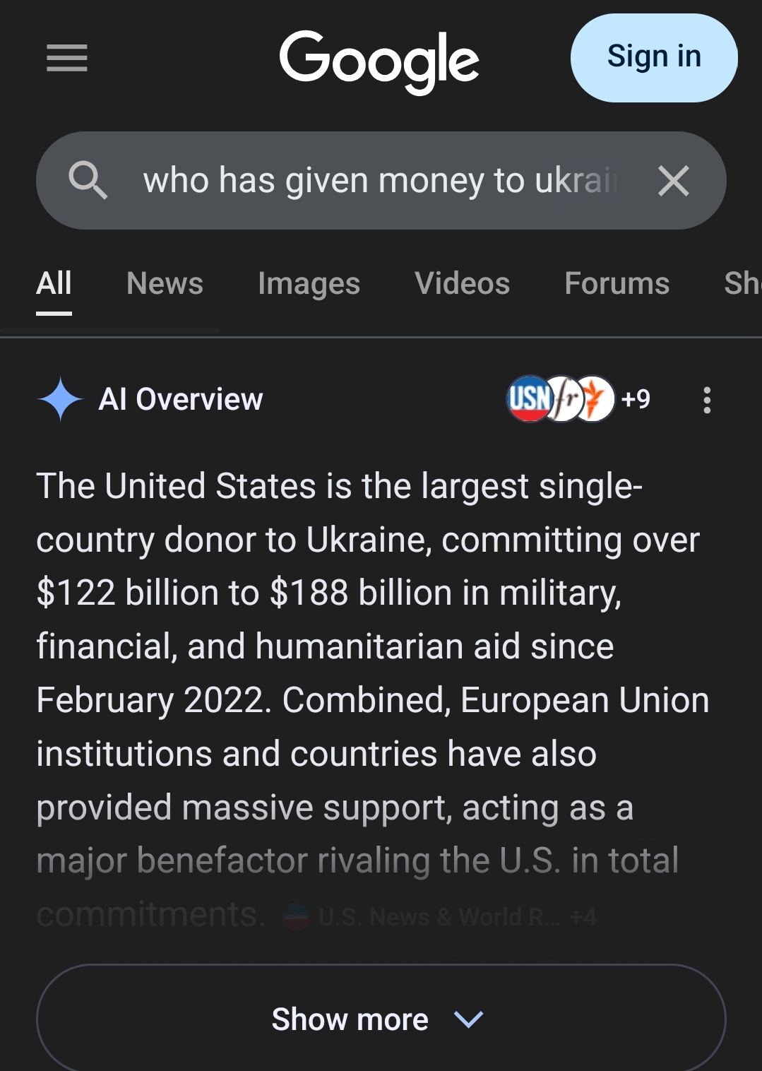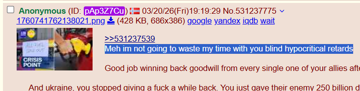 >>531355906You fail to understand that the aid numbers and the money spent are flowing into US factories, building modern equipment. The ukraine war was a great way for Americans to support their national interests and increase defense build up.>Nearly 70% of the $175 billion in U.S. aid to Ukraine since Russia’s 2022 invasion was spent in the U.S. or on U.S. forces, according to a study by the American Enterprise Institute published in May 2024.>While the U.S. is the largest absolute donor to Ukraine, it ranks 15th among countries for aid as a percentage of GDP>>531355805Oh it is not, you are spending money to suppress prices. Had it been a natural phenomenon, yes, but it is not. And you fail to take into account the strategic loss for the United States in cannibalising its deterrence arsenals in indopacom to sustain the war effort. Much less the strategic disaster which is cutting off your own allies vital supply lines without warning.Its ridiclous you think its a win that Japan has gone behind your back and made deals with Iran itself to secure passage, or that you think its a win removing sanctions on Iranian oil, or even removing sanctions on Russian oil while they contribute to the Iranian war effort.You people cope with simplistic ideas and extreme 4d chess when there is none.