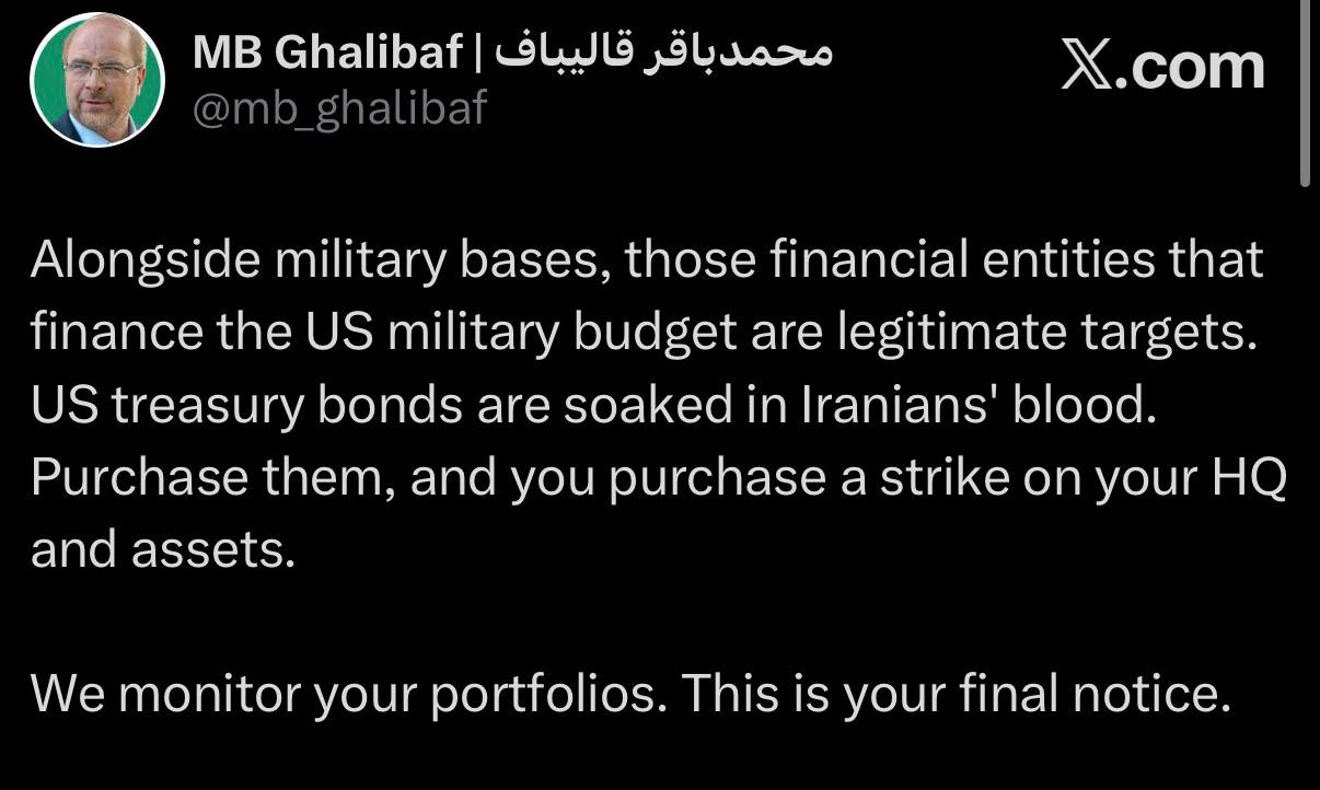 >>531365487https://x.com/mb_ghalibaf/status/2035776169656676675Alongside military bases, those financial entities that finance the US military budget are legitimate targets. US treasury bonds are soaked in Iranians' blood. Purchase them, and you purchase a strike on your HQ and assets. We monitor your portfolios. This is your final notice.
