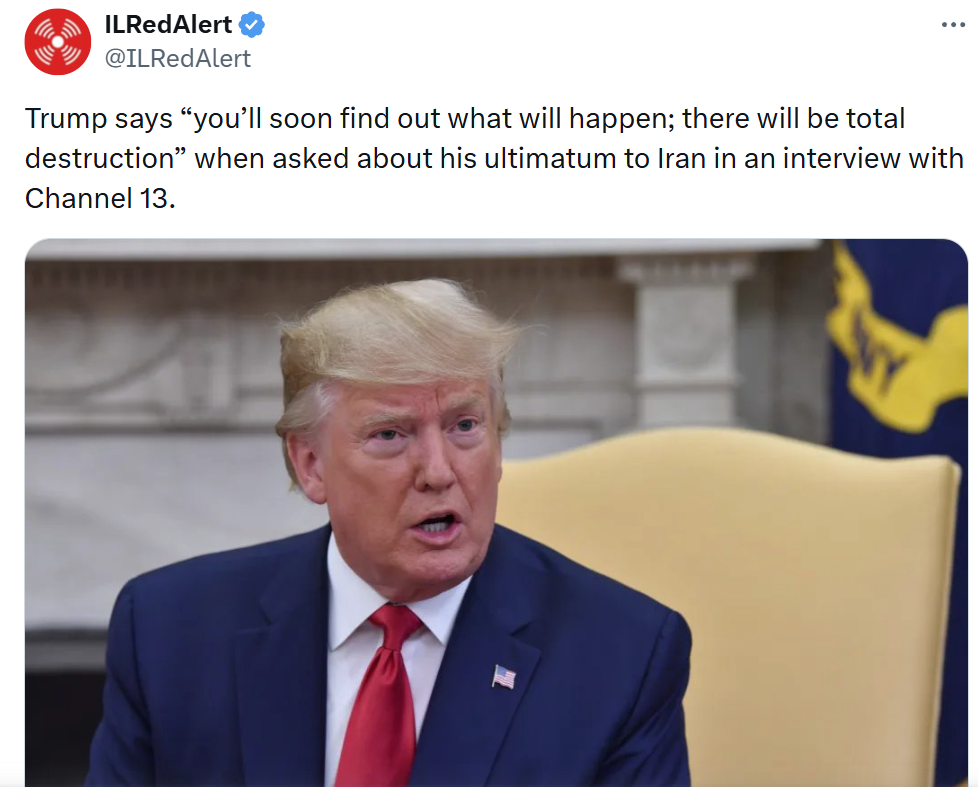 Previous: >>531362024>Trump's ultimatum expires on March 23rd 7:44 PM ESTTimeline:▶ Day 22>WTI $98>Brent Crude $112>Iran strikes southern Israel again, no casualties are known at this stage>Trump gives Iran a 48 HOUR ultimatum to open the strait of Hormuz or have theirpower plants "obliterated">From an initial investigation, the AMERICAN THAAD air defense system was supposed to intercept the missile in Arad, but it missed. Also, in the Beit Shemesh incident, it was the THAAD that missed the missile - which was identical to the missile that hit both Dimona and Arad.>At least 76 Israelis are injured by Iranian missile strikes in Arad>Iran has issued an urgent official warning calling for the immediate evacuation of the Dimona nuclear reactor in Israel.>Iran has achieved "total missile dominance over the skies of Israel", IRGC Aerospace Force Commander says>Israel successfully intercepts Iranian missiles with a building in Dimona>Air defense hits Israeli F-16, IRGC claims>Nataz uranium refinery hit>Iraq military intelligence HQ hit▶Kinohttps://files.catbox.moe/2hwzcx.mp4▶Livestreamshttps://www.youtube.com/watch?v=4E-iFtUM2kk https://www.youtube.com/watch?v=JHwwZRH2wz8 ▶Telegramhttps://rentry.org/tgnews▶Twitter accountshttps://nitter.net/clashreporthttps://nitter.net/FaytuksNetworkhttps://nitter.net/sentdefender▶Israel Rocket Alertshttps://www.tzevaadom.co.il/en/▶Air Traffichttps://www.flightradar24.com/https://flightaware.com/livehttps://globe.adsbexchange.com▶Maritime Traffichttps://www.marinetraffic.com/