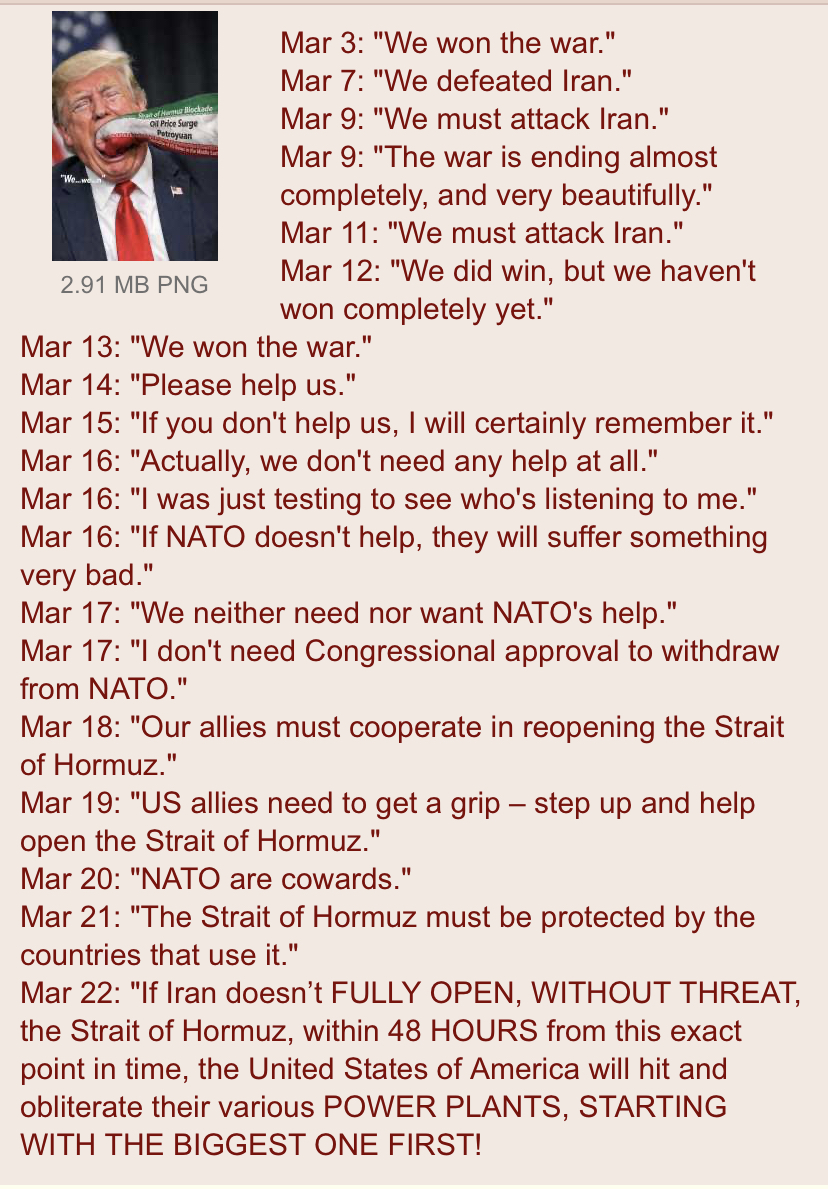 >>531387524Dumbest post I've read on /pol/ in a long time. Iran isn't a naval power, destroying their navy including an unarmed ship participating in an exercise in India isn't the big own you think it is. I could care less if Iran has a nuke or not. They could probably get one from Pakistan, NK, or Russia. During the 12 day jewhad they alluded to already having a nuke. Iran is being attacked because it was placed on the jewish 7 countries in 5 years list post 9/11. https://files.catbox.moe/sky0vr.mp4Morons have been scheming on how to start a war with Iran for a long time. https://files.catbox.moe/ph0lst.mp4Yes, the progress is so significant they refuse to negotiate with the US and at any moment they can ruin all of the infrastructure we're paid to protect. Everything is going great.