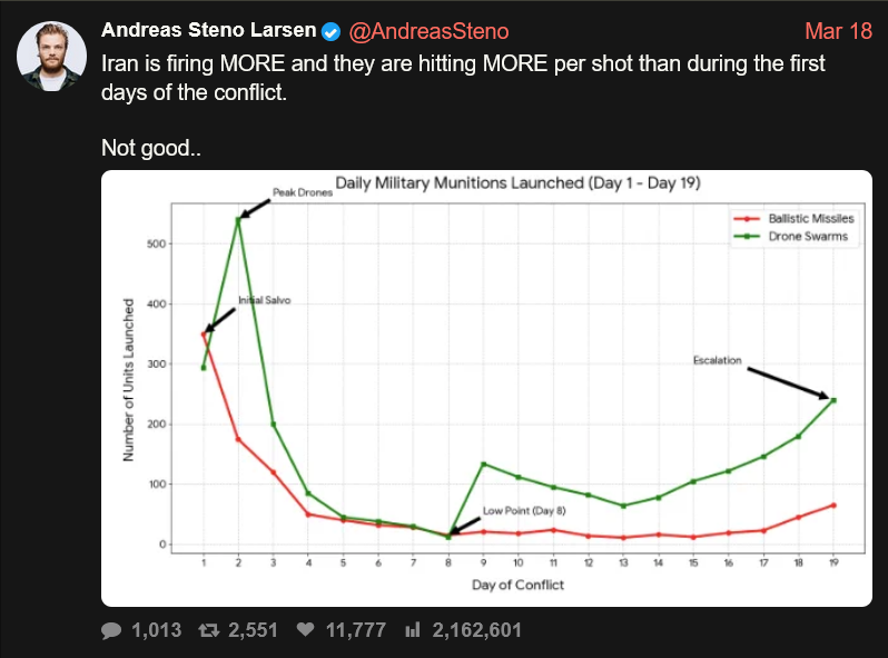 >>531387218B-2 can reach all of Iran.If the bunker busters worked, the launch rate should essentially drop to zero. The bunkers' locations are known, because the construction are easily spotted on satellite imagery.What IS perfectly consistent with launch rate going down but not going to zero? Tunnel entrances being repeatedly bombed and collapsed, which takes time to clear.Anyway, it seems people can't agree on the number of missiles and drones launched by Iran or whether there is any real "collapse".
