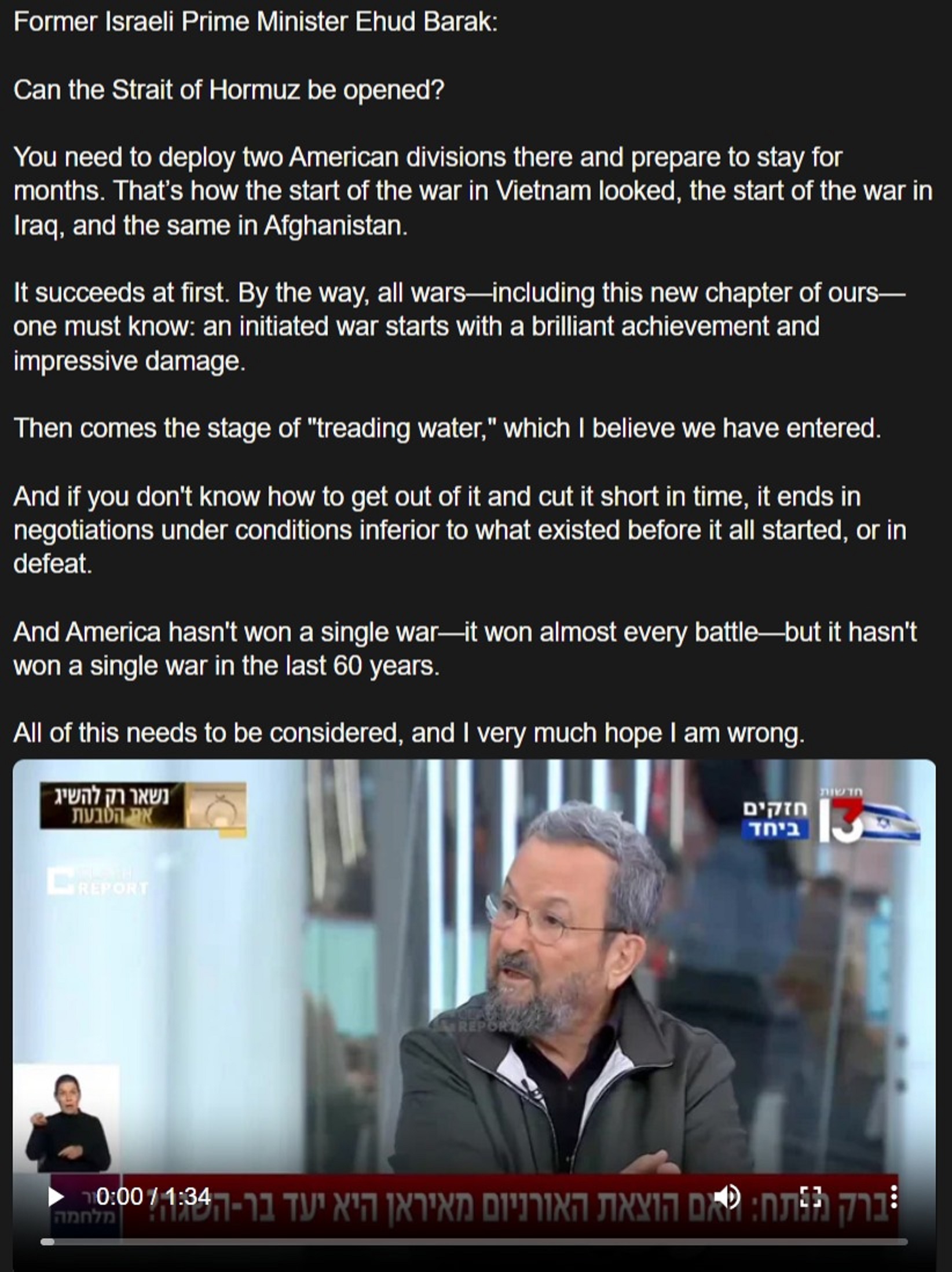 Former Israeli Prime Minister Ehud Barak:Can the Strait of Hormuz be opened?You need to deploy two American divisions there and prepare to stay for months. That’s how the start of the war in Vietnam looked, the start of the war in Iraq, and the same in Afghanistan.It succeeds at first. By the way, all wars—including this new chapter of ours—one must know: an initiated war starts with a brilliant achievement and impressive damage. Then comes the stage of "treading water," which I believe we have entered. And if you don't know how to get out of it and cut it short in time, it ends in negotiations under conditions inferior to what existed before it all started, or in defeat.And America hasn't won a single war—it won almost every battle—but it hasn't won a single war in the last 60 years. All of this needs to be considered, and I very much hope I am wron