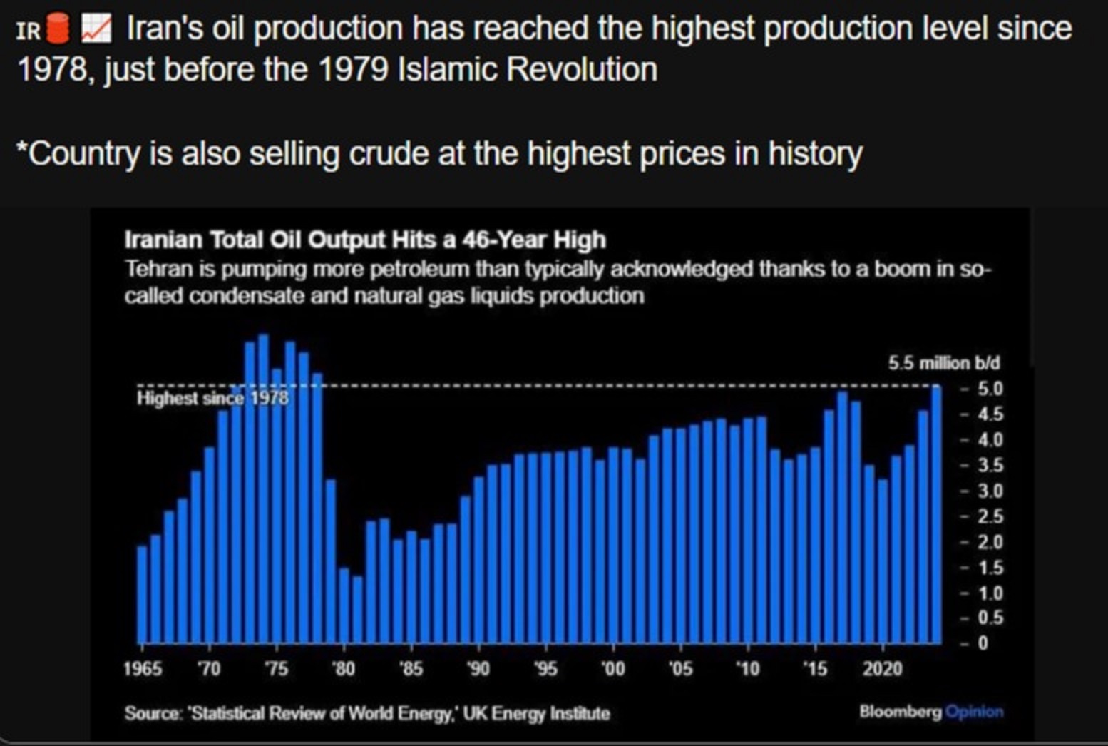 Iran's oil production has reached the highest production level since 1978, just before the 1979 Islamic Revolution