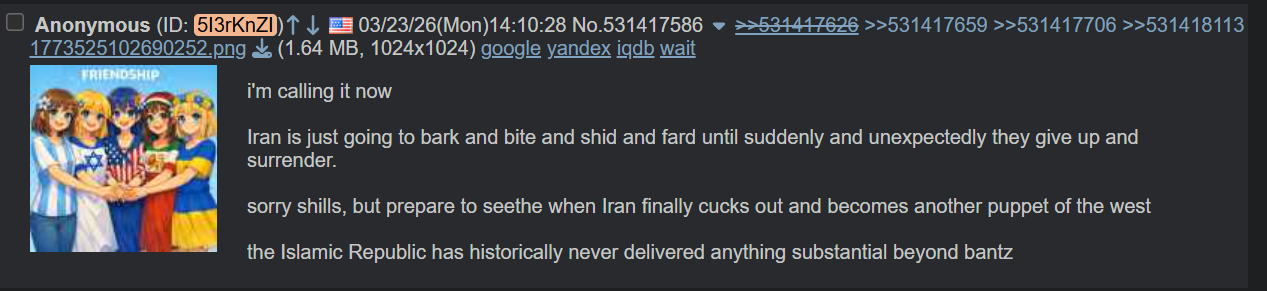 >>531419471I despise this man.Pic related.>>531419517It's very coherent. Hundreds of millions of people could die if Iran decides to demolish the petrodollar by destroying all of the oil equipment in the gulf. That blood will be on their hands, and Allah does not appreciate wanton slaughter of his people no matter how easily it can be explained away as collateral damage. It isn't about their economy, but their proclivity to NOT inadvertently kill people who've done nothing wrong. Iran sees the world held hostage by the Great Satan, and if Iran takes their shot and misses, the Great Satan survives while the innocents whither away and die.