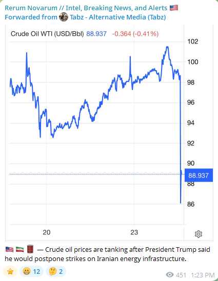 >>531421870trump issued an ultimatum to iran that he would destroy their power plants if they do not open the hormussyiran promised to destroy select targets across the GCC, desalination and power plantsyesterday Iran (speculative under pressure by turkey dropped qatar off the target list, under pressure by pakistan reduced the promised hits on saudi arabia presumably)kuwait, UAE and Bahrain set to be destroyed fully as countries (iran has that capacity 100% demonstrated so far that they can hit and destroy anything in the gulf if they want to at that range)deadline ends today, the US treasury is rigging the US oilmarket to prevent it from spiking above 100$ to keep the american public calm as trump is dog walked into this war