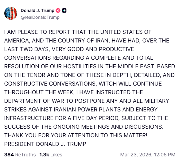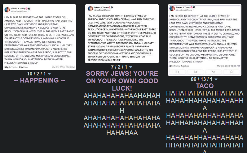 >I have agreed not to commit major warcrimes in IranSo...the straight of Hormuz is still closed and the gulf-arabs and Israel are still being bombed, it's just that Trump isn't escalating to a whole other level of clusterfuck.That did'nt require any negotiating you fat orange fuck, that's just you choosing not to make the situation worse...for 5 days. You spending that time golfing again?