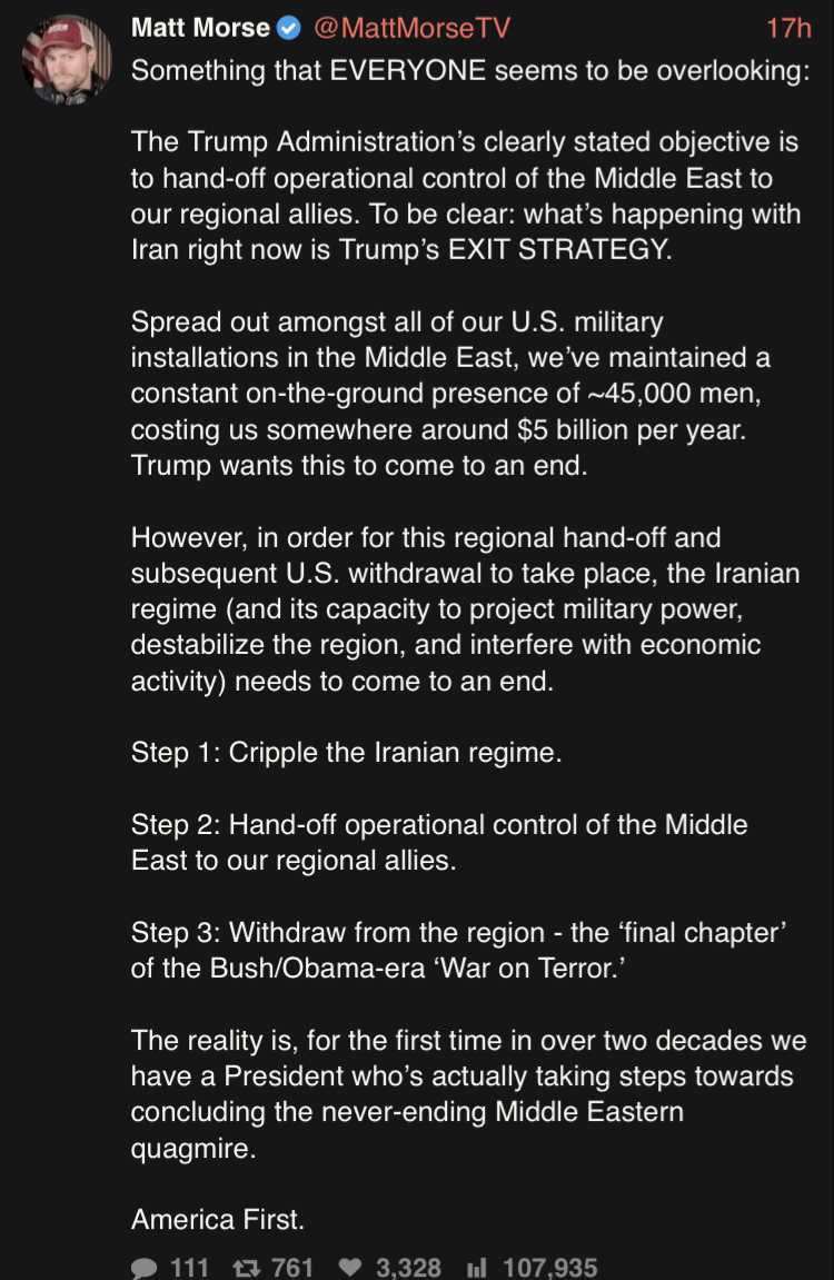 >>531425055i'd believe the war has something to do with friendly aliens being captured by iran and we're trying to rescue them before i believe any of that convoluted 50-D chess nonsense