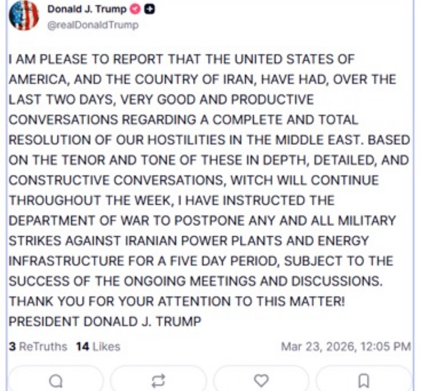 >>531433197No its only to gaslight the markets. Trump just won't stop blustering and lying in order to keep oil prices down. First he threatened Iran trying to trick them into surrender. And now today he's lying about talks when he just threatened to blow up their reactors. Over and over and over. It's never going to stop. He needs to stfu.