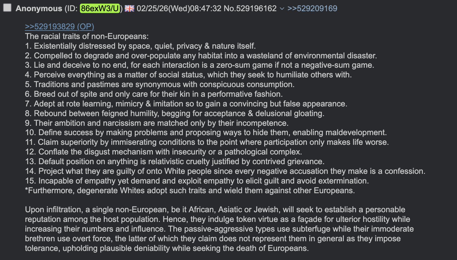 >>531429665It's my attempt to trace a wide range of behaviors to a common source trait, and yeah it makes a lot of seemingly different ethnic behavior click.Striving represents a fundamental difference between how whites and nons view morality, but it can manifest in many different ways depending on the particular traits of a particular ethnicity.East Asians, for example, strive just as much as jeets or bantus. Their high intelligence just shifts behavioral incentives towards educational "grinding" rather than bluffing to achieve high status. In both cases they're actually very diligent about honing their skills, but unlike the german mechanical engineer whose interest in physics and math is purely in as tools for doing the cool shit he actually wants to do, the chink simply memorizes the theory and basic application in order to get that prestigious job and title. That is why even the highly intelligent populations in East Asia are far less capable than whites when it comes to innovation. Sure, they can perform modern iterative science better than most, but since they value the aesthetics of respectability over competence, their institutions select for people who are "politician smart" rather than "research smart". The smartest jeets (and most other nons) are also usually like this, and can also be very competent if their job doesn't involve creative reasoning. The other common manifestation of the striver phenomenon is bluffing; Lying to cover for previous lies, doing everything they can to dump responsibilities onto coworkers or subordinates and most importantly, doing everything in their power to avoid taking responsibility by pinning it on someone else. These types are what you get when the striver isn't smart enough, and it's rampant even in ostensibly highly intelligent nations like China, as the vast majority of the population is still at or below the western average and therefore create the same nonwhite social norms.
