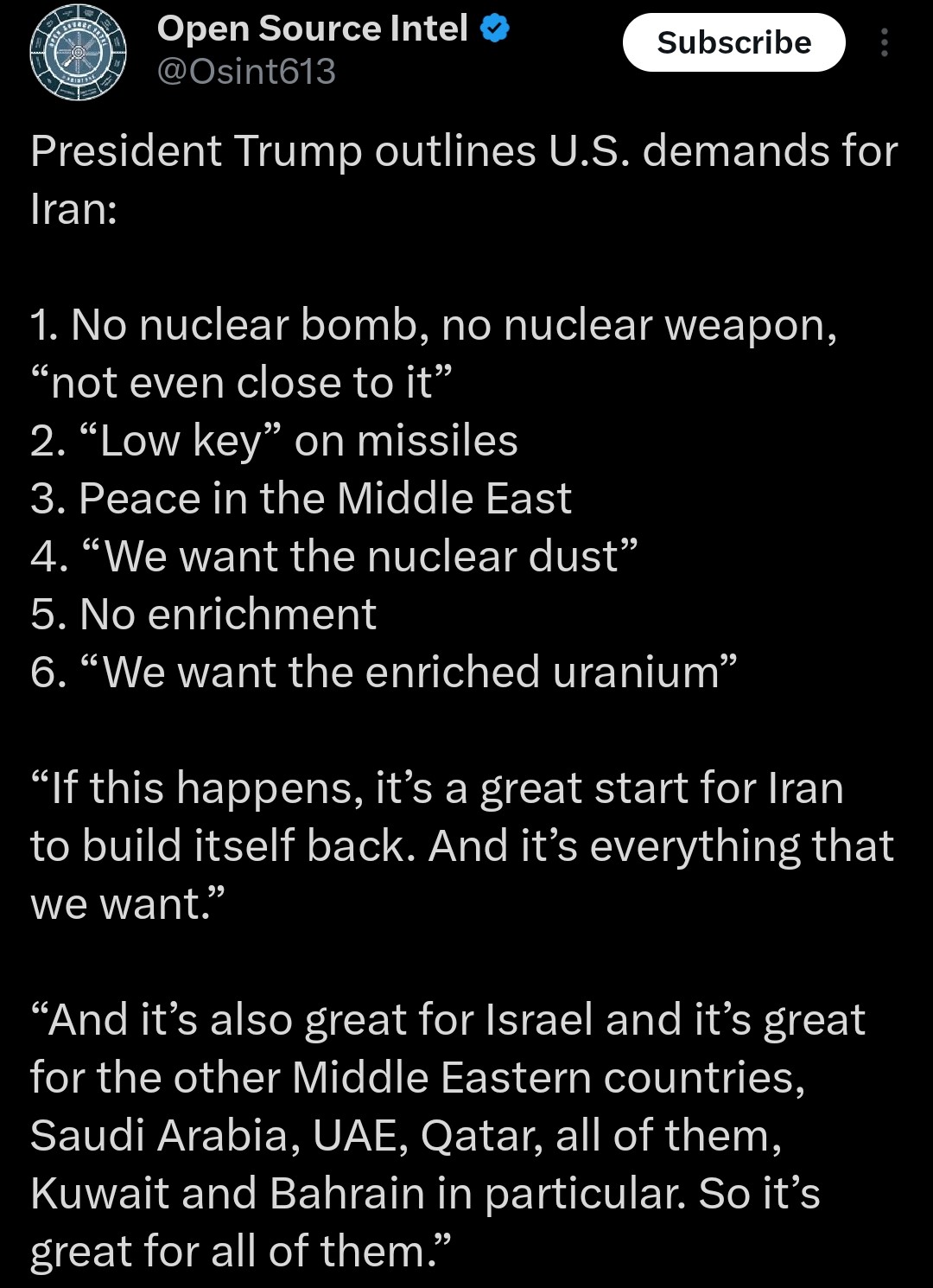 If Iran does make peace then I think it would be fair to officially write them off as an actual threat from now on. They need to hit back and hit back hard to deter future aggression, if they don't then nothing stops the US and Israel doing this again in a few months time.