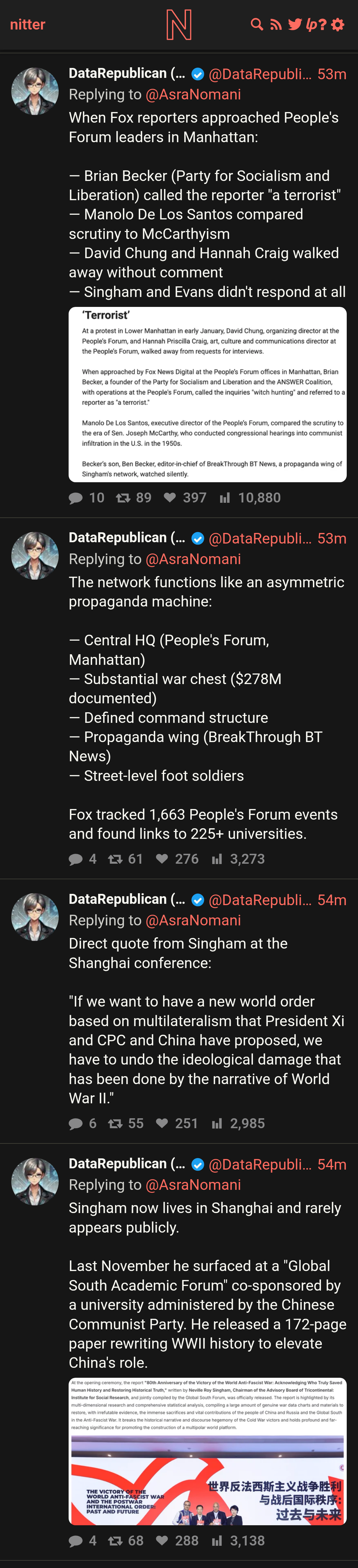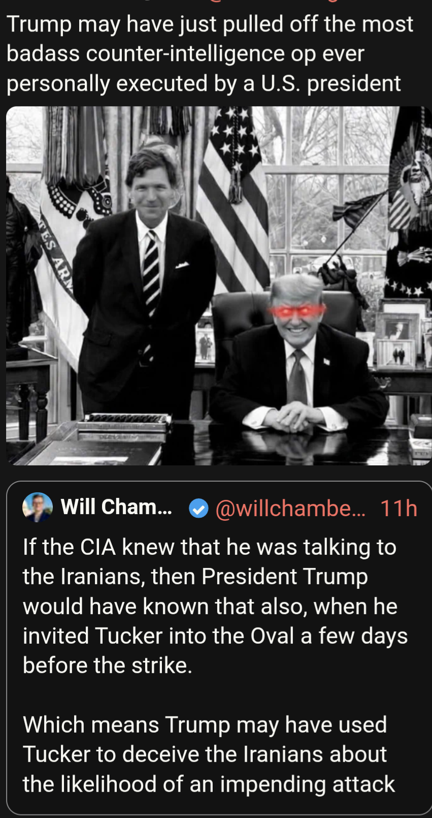 Holy shit, I think Tucker is taking Singham money... Or ideologically agrees with him... Tucker talking about the multi polar world and coming to terms with China right now is too much of a coincidence to be chance. https://nitter.net/DataRepublican/status/2036098351884796232#mhttps://youtu.be/OAVtOYTyUOY
