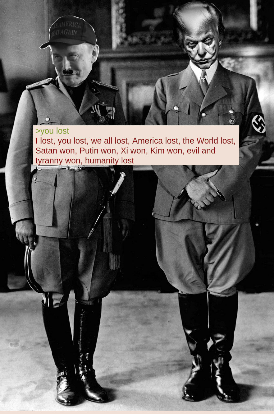 >>531441465>nobody can stop orange Hitler? That means he has total control of the whole entire worldIf only